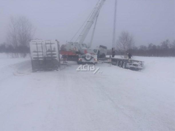 На автодороге Тымовское - Ноглики 3 февраля тягач слетел с дороги. В районе организовали операцию по вызволению большегруза из снежного плена.
