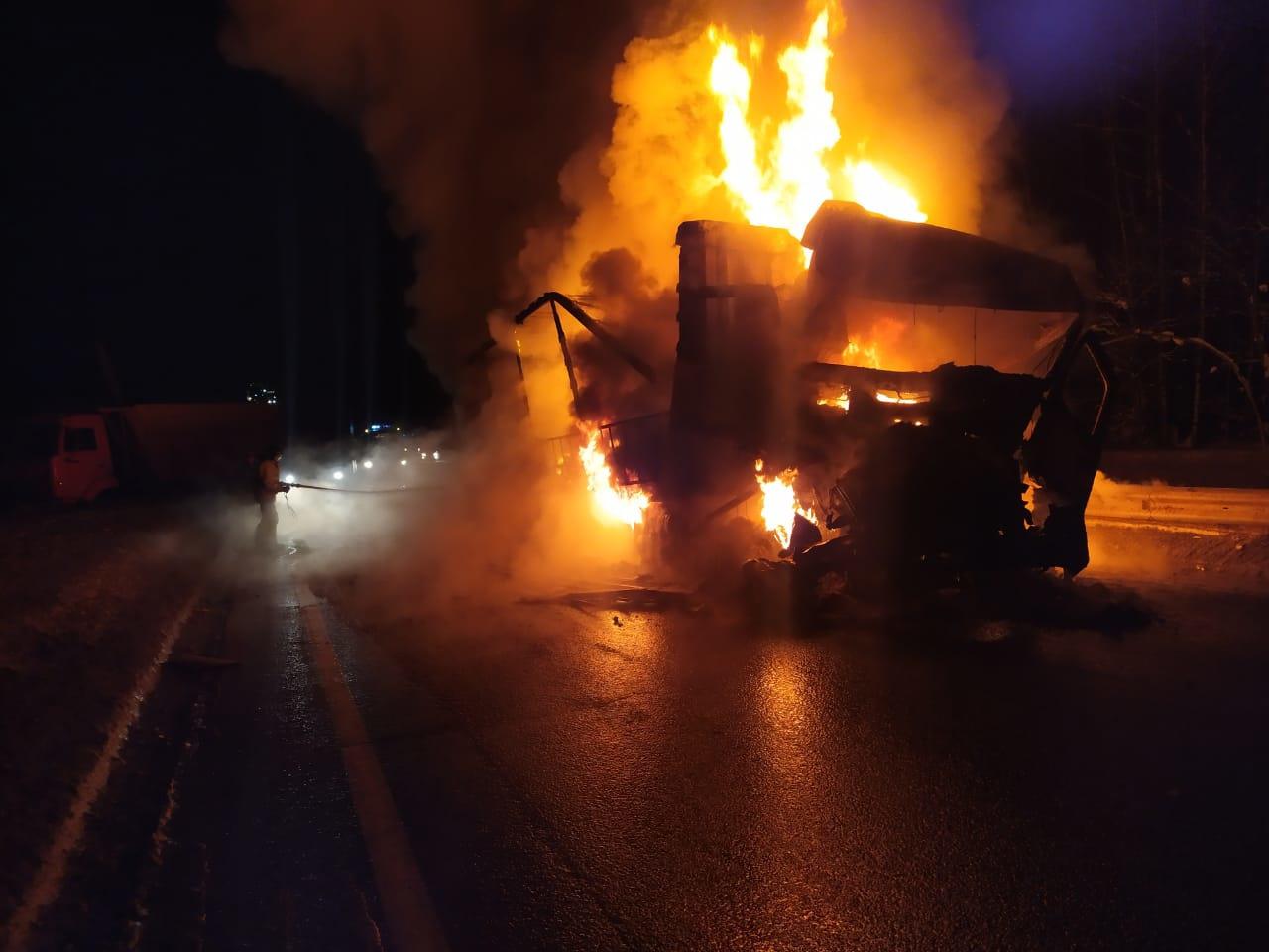 После столкновения «Мерседес» загорелся. Для тушения привлекались 8 сотрудников МЧС. Большегруз выгорел полностью. Водитель загоревшегося грузовика с травмами доставлен в больницу. Вязниковцы сообщали утром в соцсетях, что на федеральной трассе образовалась пробка.