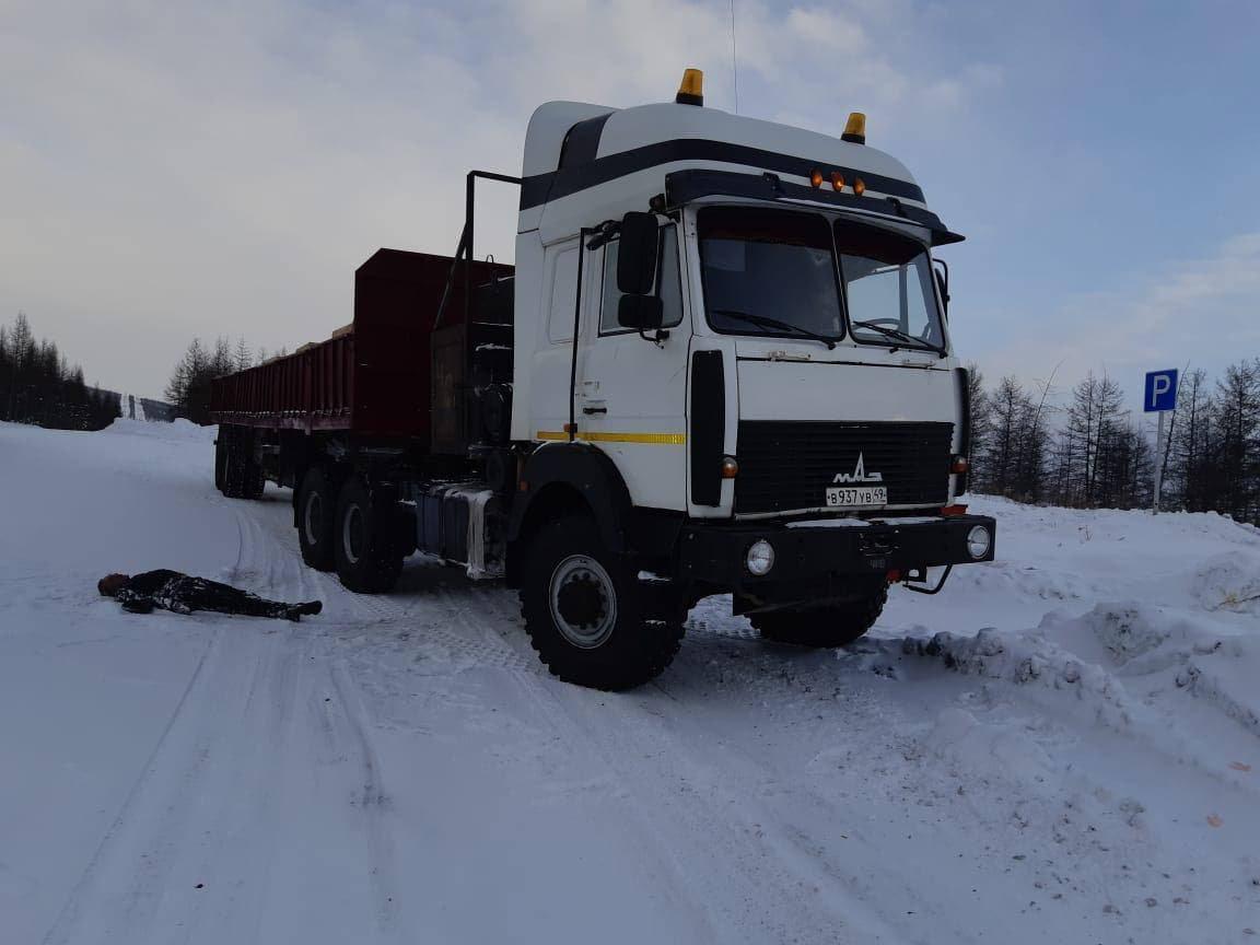 В Магадане публикуют фото водителя "МАЗа", который по данным из соцсетей, лежит у машина на 1293 км трассы Р-504 Колыма. Согласно распространившемуся аудиосообщению, водитель мертв, предположительно, он упал с колымбака (дополнительный бак, который ставят магаданские и якутские водители к грузовику, чтобы было больше топлива).