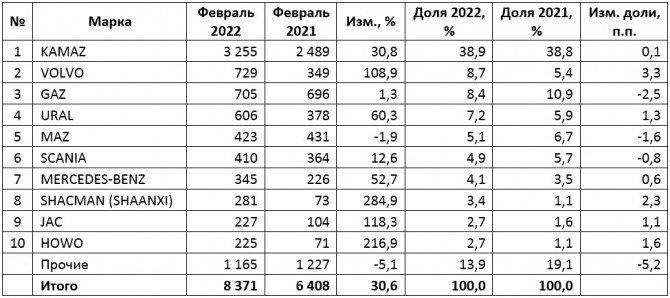 Пятерку лидеров традиционно возглавляет российский производитель КАМАЗ, который за отчетный период реализовал 3,255 тыс единиц, что на 30,8% выше уровня февраля 2021 г.