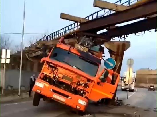 В районе проходной АО «Корунд» в Дзержинске грузовик с металлолом столкнулся с опорой эстакады. Водитель не рассчитал габариты и застрял под эстакадой. Происшествие случилось вечером 18 апреля.