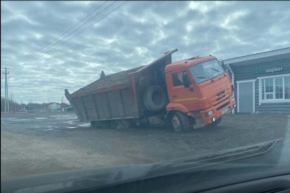 Перегруженный песком КамАЗ в буквальном смысле провалился сквозь землю. Инцидент произошел в деревне Касимово в Ленобласти. ЧП стало иллюстрацией к рейду по весовому контролю, который прошел в регионе в период весенней просушки дорог.