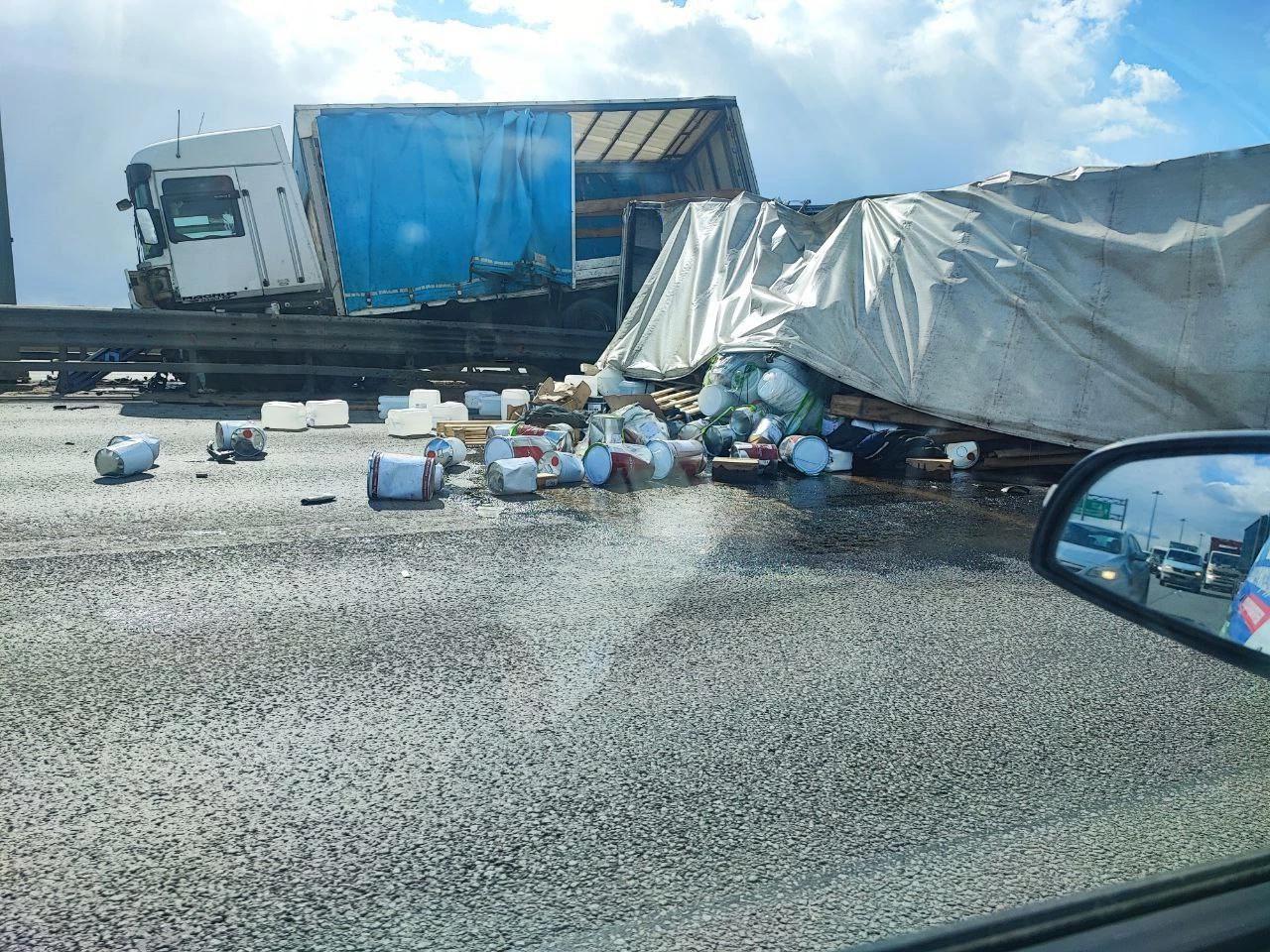 «На внутреннем кольце КАД при подъезде к Таллинскому шоссе фура с прицепом с краской пробила ограждение, краска разлилась на три полосы», — рассказывают очевидцы в группе «ДТП и ЧП | Санкт-Петербург» во «ВКонтакте».