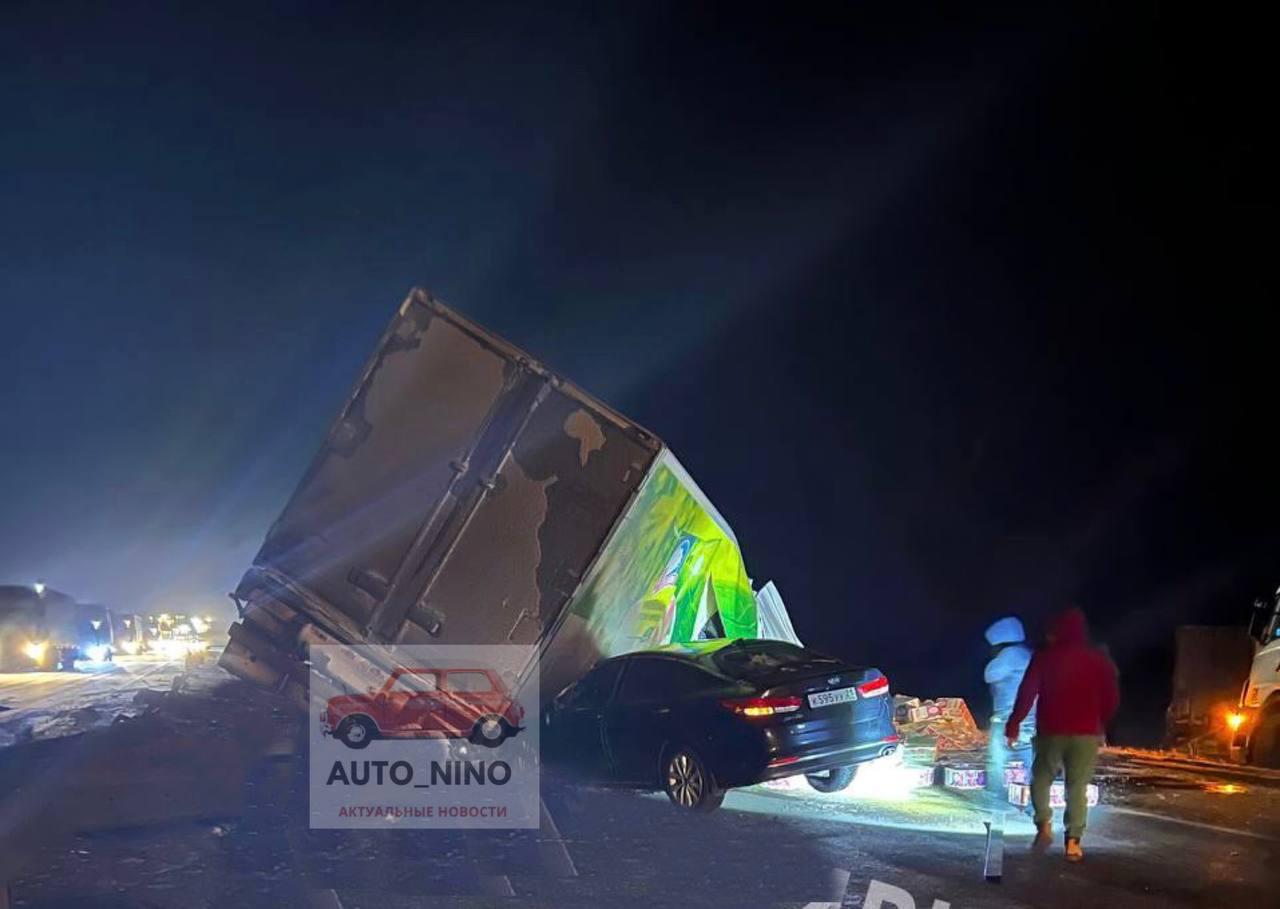 По словам очевидцев, виновником аварии был водитель фуры. Грузовой автомобиль опрокинулся из-за наледи на дороге и налетел на легковушку.