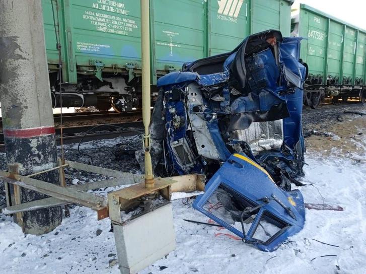В пресс-службе пояснили, что от удара прицеп автомобиля отбросило на соседний путь под еще один проходящий грузовой поезд. В ДТП водитель грузовика погиб.