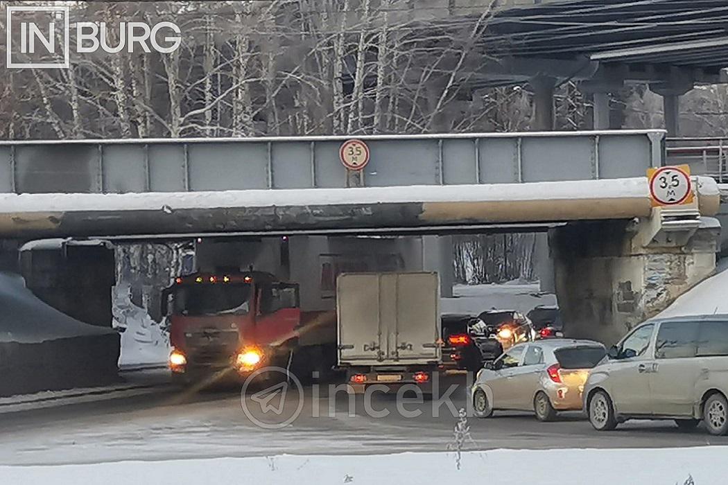 Фотографию застрявшей под мостом фуры прислал в паблик «Инцидент Екатеринбург» ВКонтакте один из подписчиков.