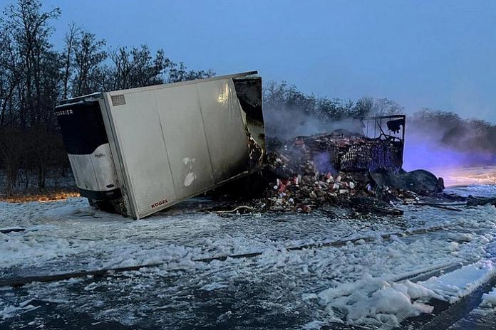 Авария произошла в пятницу, 16.12.2022, в 6:40 на 694-м км трассы М-4 «Дон». По предварительной информации, у 63-летнего водителя автомобиля МАЗ, жителя Московской области, во время движения по дороге лопнуло колесо, из-за чего произошло возгорание транспортного средства.