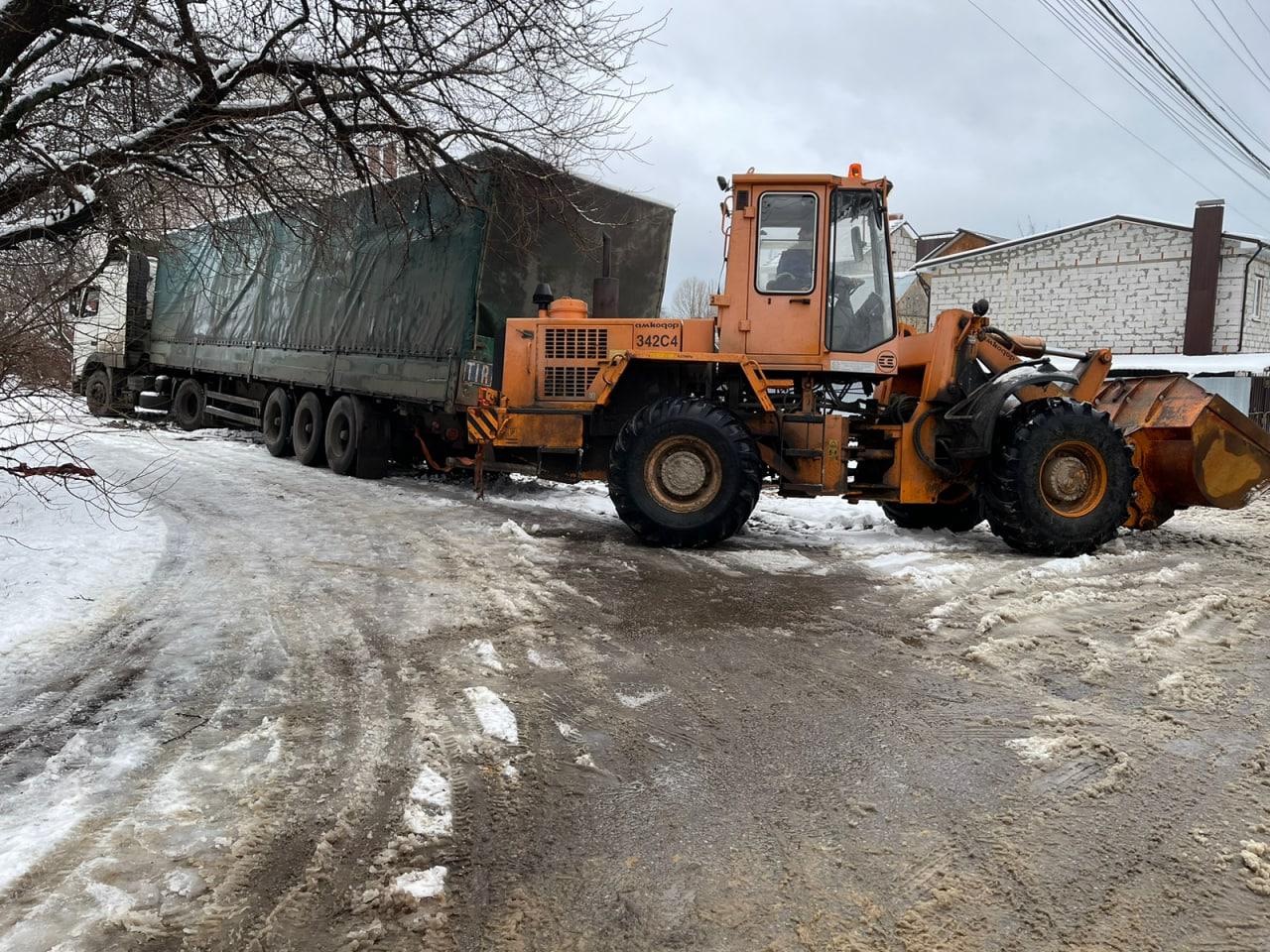 Дальнобойщик попал в ловушку на дороге по улице Республиканской. Вытаскивали большегруз с помощью трактора-погрузчика, принадлежащего местному жителю.