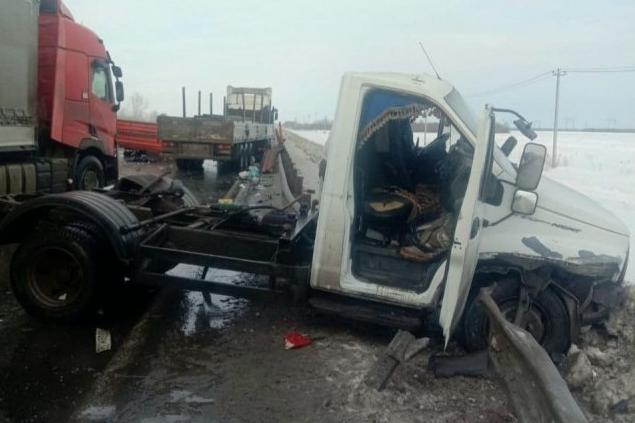 На 46 км федеральной трассы большегруз Mercedes въехал в стоящий автомобиль дорожной службы «Газель Next».
