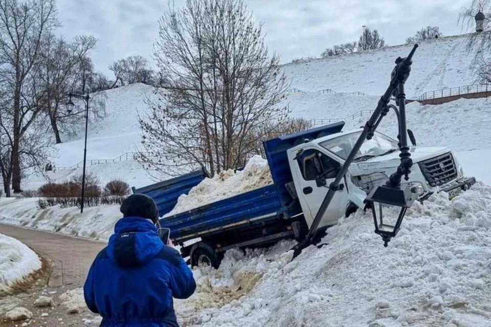 Грузовик, гружённый снегом, снес фонарный столб на Ивановском съезде на территории Нижегородского кремля. В результате машина наполовину застряла в сугробе, а световая опора согнулась к земле. Инцидент произошёл днем 15 марта.