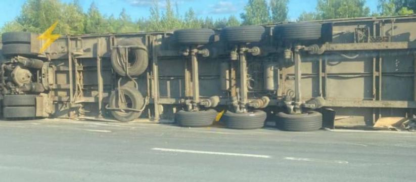 Накануне на Лаишевском кольце после Президентского моста в Ленинском районе Ульяновска большегруз завалился на бок.