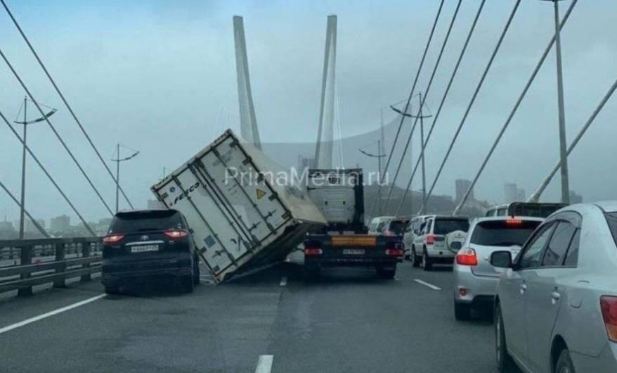 ДТП блокирует движение на Золотом мосту. Из-за порывов ветра контейнер рухнул с грузовика на рядом стоящую легковушку. О состоянии водителя ничего не сообщается.