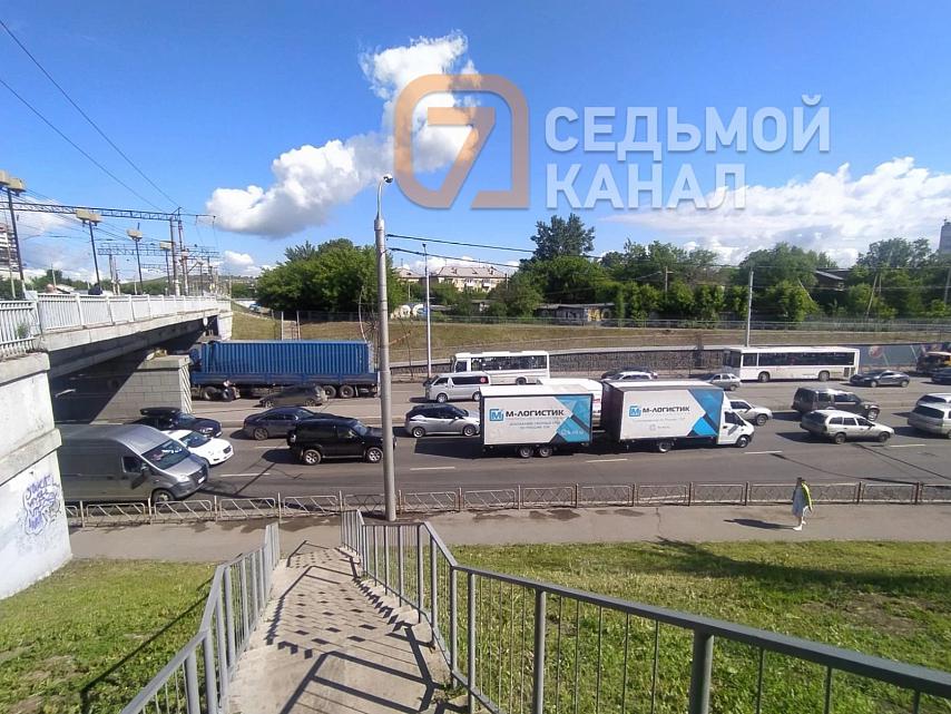 В Красноярске фура не рассчитала габариты и застряла под мостом на Космосе. ДТП произошло утром 27 июня.