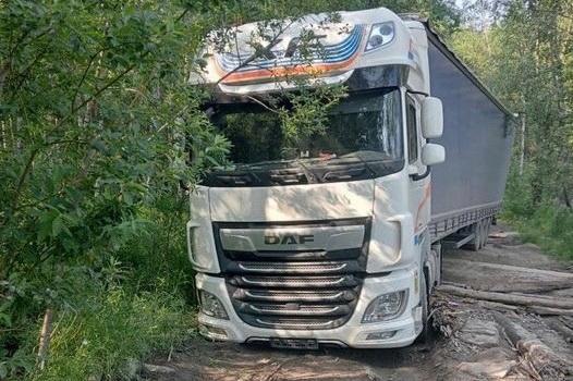 В лесу под Екатеринбургом застряла фура из Казахстана. На грунтовую дорогу дальнобойщика вывел навигатор, в итоге он съехал с проезжей части и завяз в грязи в 200 метрах от скал Чертово городище.