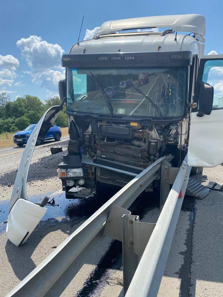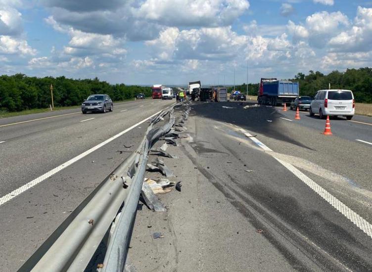 По предварительным данным, У «Тонара» на ходу разорвалось заднее колесо. Полуприцеп занесло, и он опрокинулся на разделительное ограждение. Двигаясь по инерции, он разрушил его металлическую часть и повредил покрытие дороги.