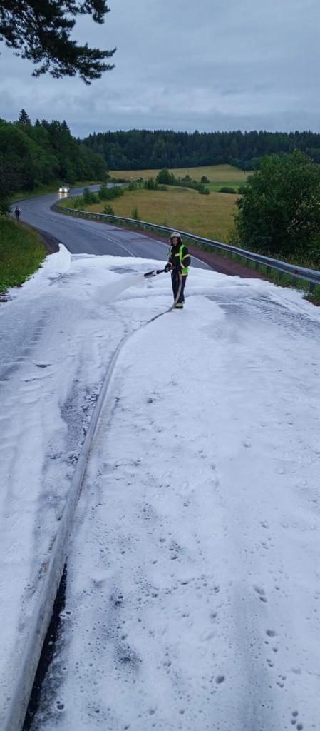 Устранять последствия разлива спасателям пришлось в 20.56 вечера 24 июля. Работа пожарных вызвала небольшую «пробку» на федеральной трассе.