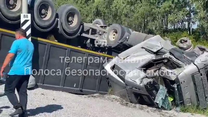 На автодороге перевернулся грузовик с щебнем, задев встречный трал. Водитель грузовика с щебнем находится в больнице. По предварительным данным, причиной ДТП мог стать сон за рулём.