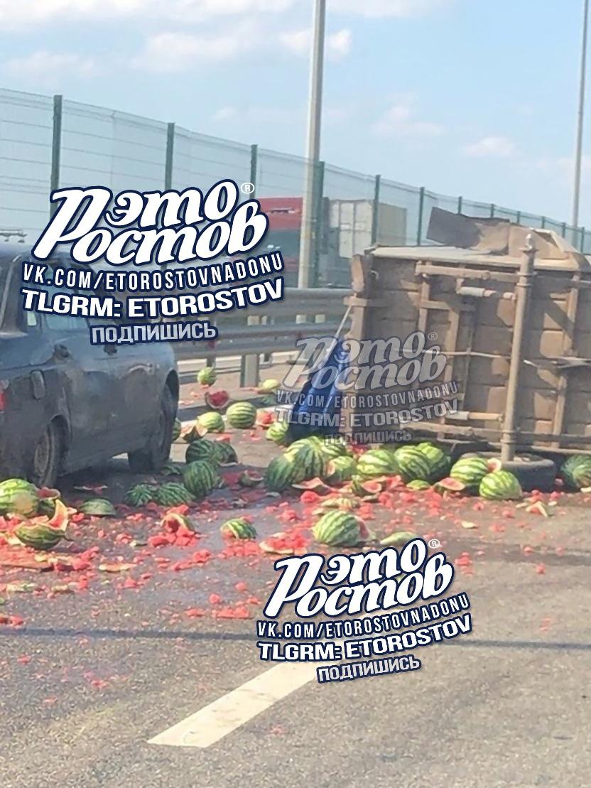 На трассе М-4 под Новочеркасском перевернулся прицеп с арбузами. Об этом в социальных сетях сообщили очевидцы, ростовчане также опубликовали фотографии с места происшествия.