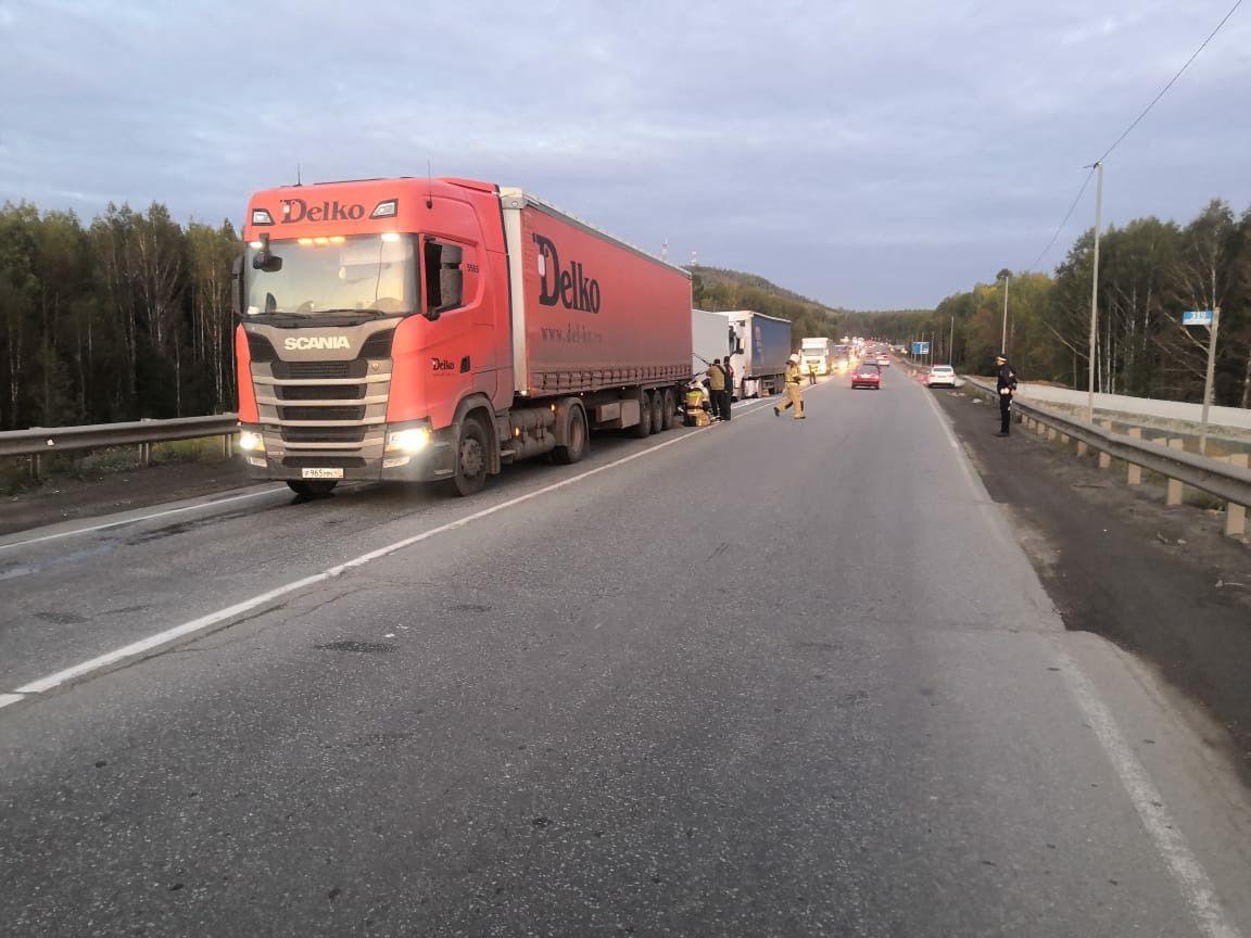 На 320 километре трассы Пермь-Екатеринбург вечером 13 сентября столкнулись три грузовика.