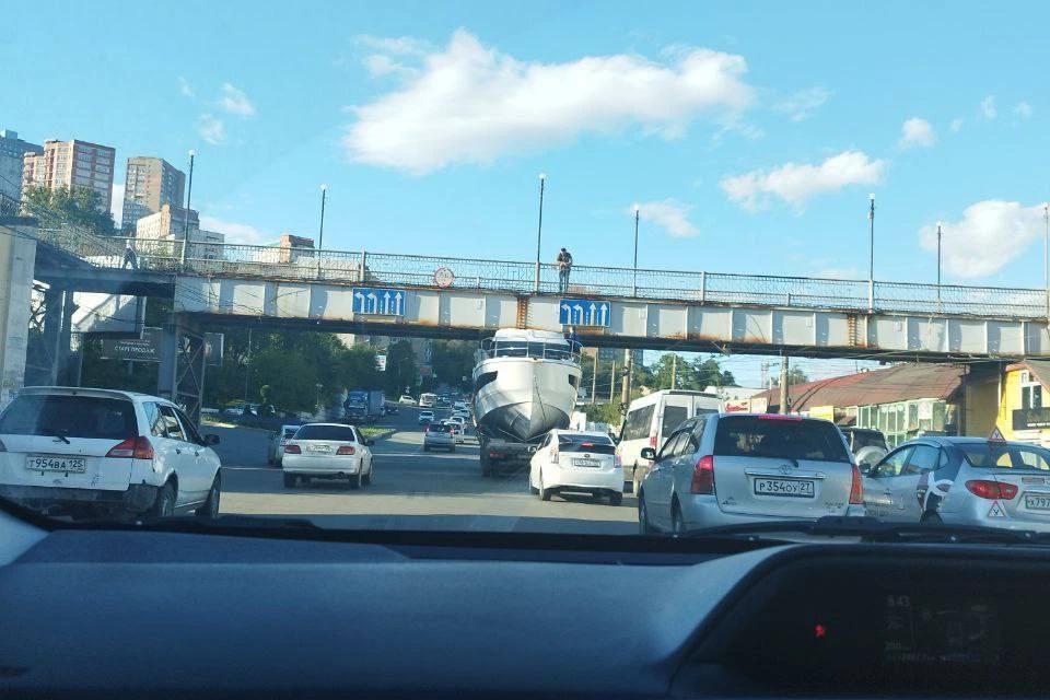 Во Владивостоке продолжается какой-то странный флешмоб застрявших под мостами и виадуками большегрузов. Но в этот раз в неприятной ситуации оказался грузовик с катером на платформе. Он перегородил движение, а судно впечаталось в возвышенную конструкцию. При этом за один день водитель умудрился дважды устроить подобное ДТП, сообщает «Комсомольская правда – Владивосток».