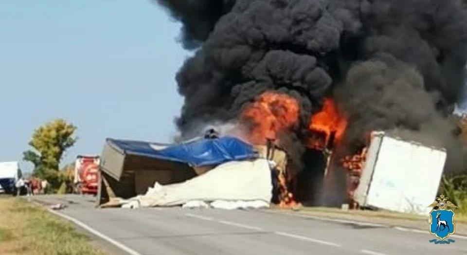 По словам свидетелей происшествия, автомобили после столкновения загорелись. Они сообщают о сильном пожаре. Одна из фур почти полностью перегородила проезжую часть, вторая скатилась в кювет. Информации о пострадавших пока нет.
