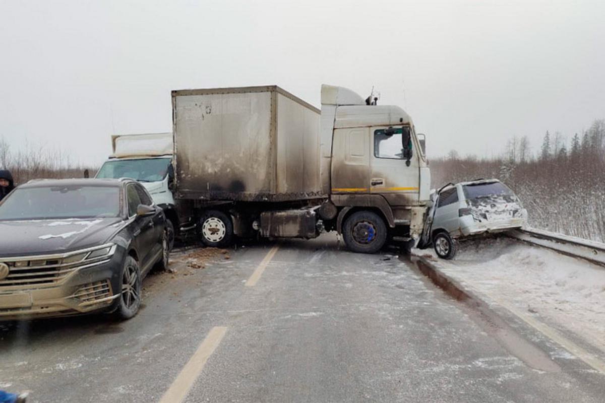 Мужчина не учел сложные погодные условия (гололед). Грузовик с прицепом развернуло, он врезался в остановившиеся впереди в попутном направлении машины, а также выехал на встречную полосу и столкнулся с автомобилем ВАЗ 21114 («Ока»).