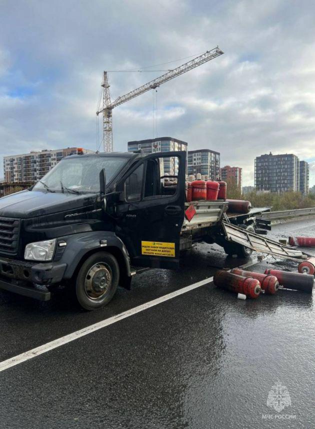 Дорожники перекрыли дорогу на КАД после аварии с грузовиком, перевозившим баллоны с пропаном. Часть из них разгерметизировалась.