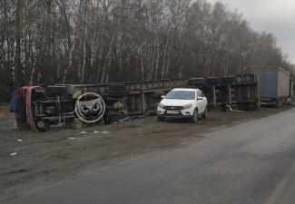 Судя по снимку, водитель фуры по каким-то причинам не справился с управлением, отчего машина выехала на обочину и опрокинулась на бок.