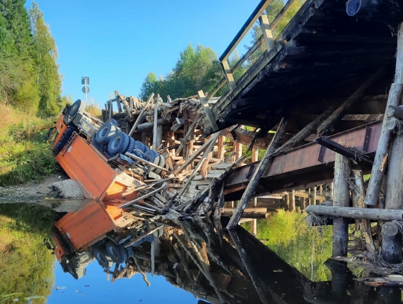 Переезжая реку Ёмба, грузовик рухнул вниз вместе с основанием моста. Теперь проезд по мосту невозможен. Администрация района приступила к организации временной переправы, дорожная техника приступила к работам. Сооружение, скорее всего, закончат сегодня.