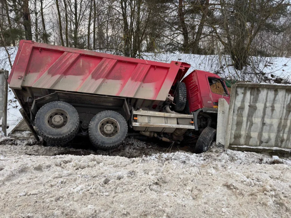 «Приору» смяло и выбросило в кювет. Самосвал также снес пролет бетонного забора.