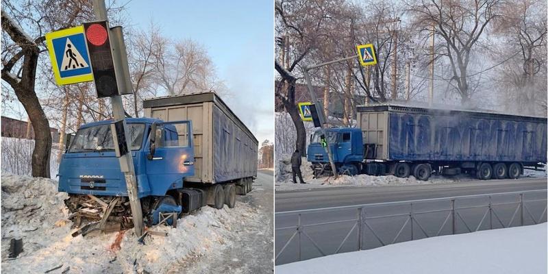 Дорожно-транспортное происшествие с участием грузового автомобиля случилось в Новосибирске 17 февраля 2025 года. КамАЗ, который вёз сельскохозяйственных птиц, врезался в светофор на пересечении улиц Эйхе и Первомайской в Первомайском районе города.