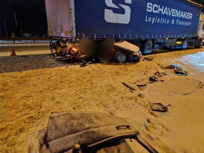 Судя по кадрам с места, в момент удара трасса была припорошена снегом. Легковушка буквально залетела под большегруз.