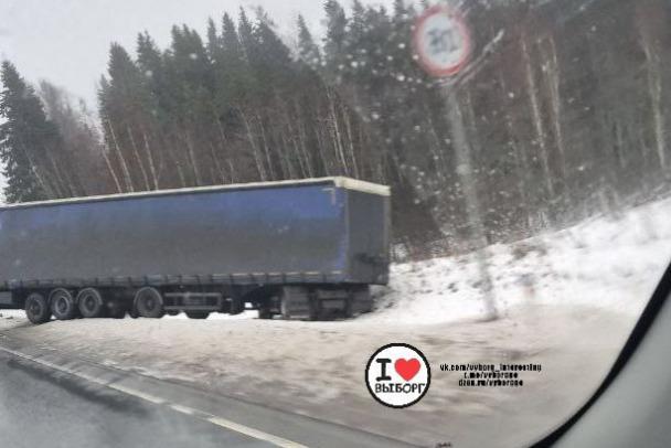 Большегруз съехал в кювет на трассе в Выборгском районе Ленобласти. ДТП произошло недалеко от закрытой границы.