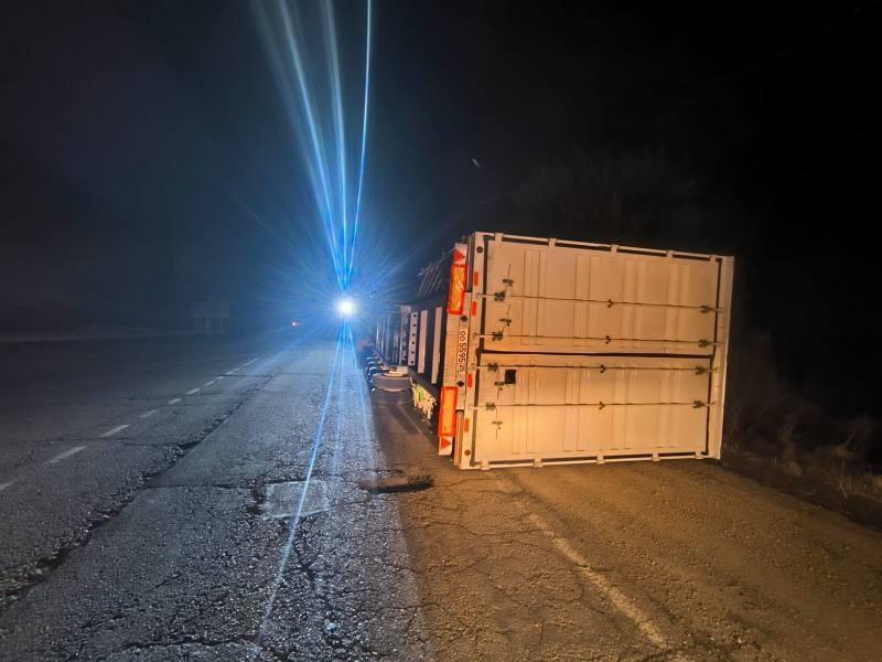 По предварительным данным, 37-летний водитель большегруза Freightliner Argosy не справился с управлением при повороте направо, в результате чего транспортное средство с товаром опрокинулось. Водитель не пострадал.