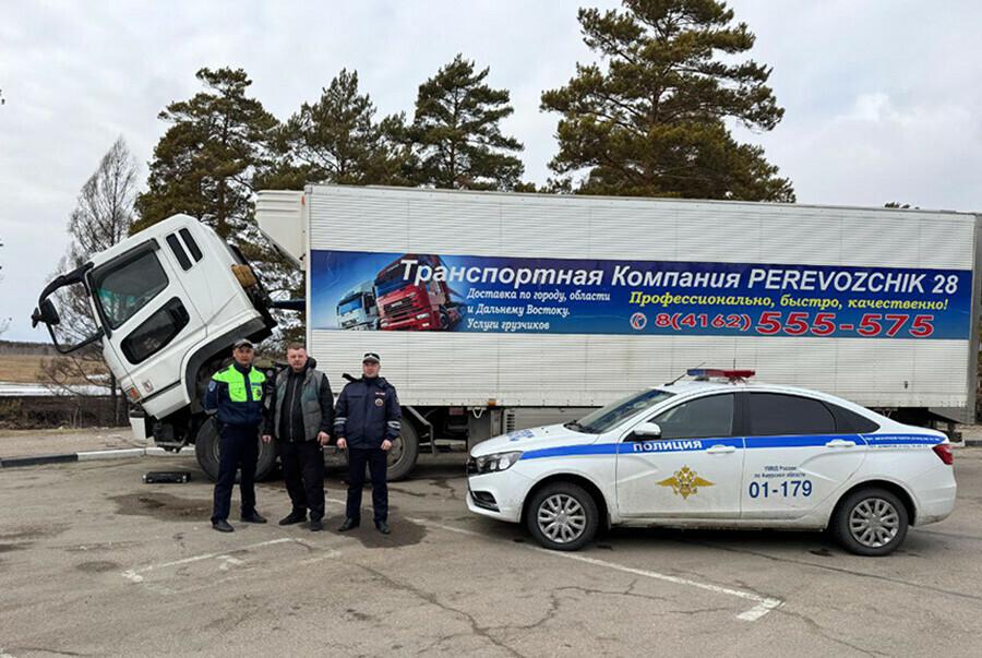 9 апреля 2025 года в Шимановском округе на 1 298 километре автомобильной дороги «Амур» экипаж дорожно-патрульной службы ОСБ ДПС Госавтоинспекции – старшие инспекторы ДПС старшие лейтенанты полиции Денис Первухин и Александр Николаев – заметил грузовой автомобиль Mitsubishi Fuso, у которого произошла поломка.