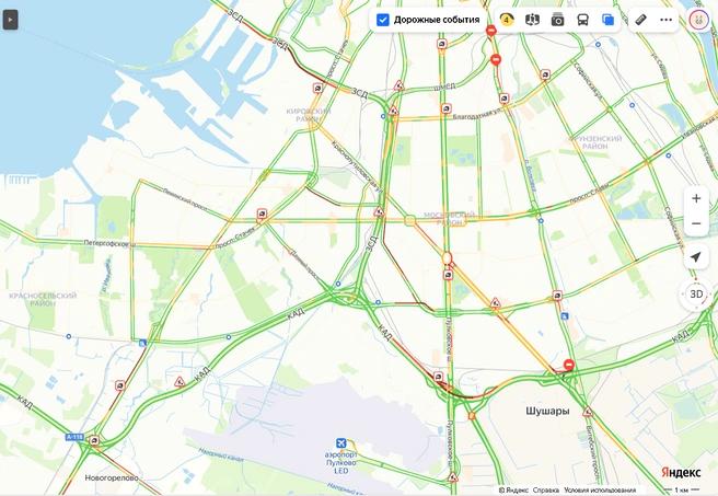 По данным «Яндекс.Пробок», на ЗСД скопился затор в южном направлении. Он начинается в районе моста через Корабельный фарватер и тянется больше 4 километров почти до Витебской развязки. Одновременно встали подъезды к магистрали: Кубинская, Благодатная, Автомобильная улицы.