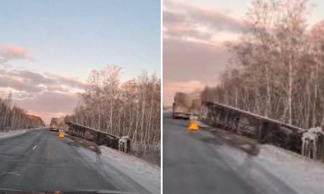 На трассе «Новосибирск – Павлодар» в Новосибирской области с трассы слетела фура. Автомобиль перевернулся на бок.