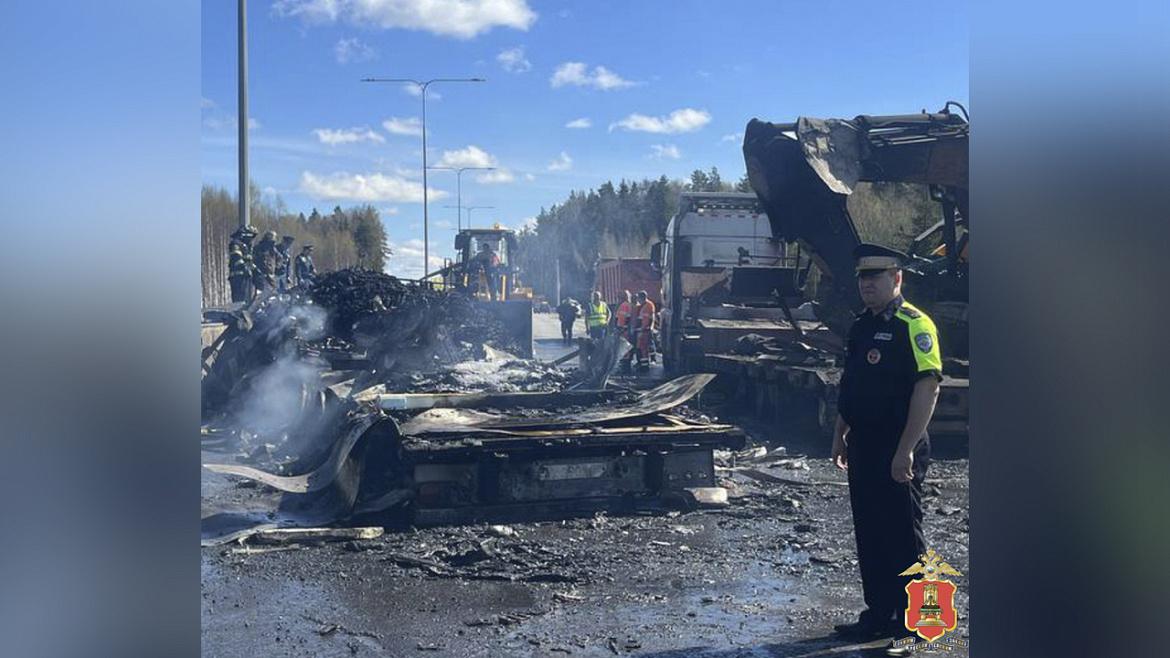 Предварительно установлено, что во время движения у автомобиля Mercedes-Benz Actros, за рулём которого находился мужчина 1983 года рождения, на ходу разорвалось колесо. От этого тягач совершил боковое столкновение с перевозившим экскаватор попутным грузовиком SITRAK под управлением мужчины 1979 года рождения, а тот по инерции наехал на двигавшийся впереди автомобиль Omoda, за рулём которого находился молодой человек 2002 года рождения. Далее на месте аварии произошло возгорание.