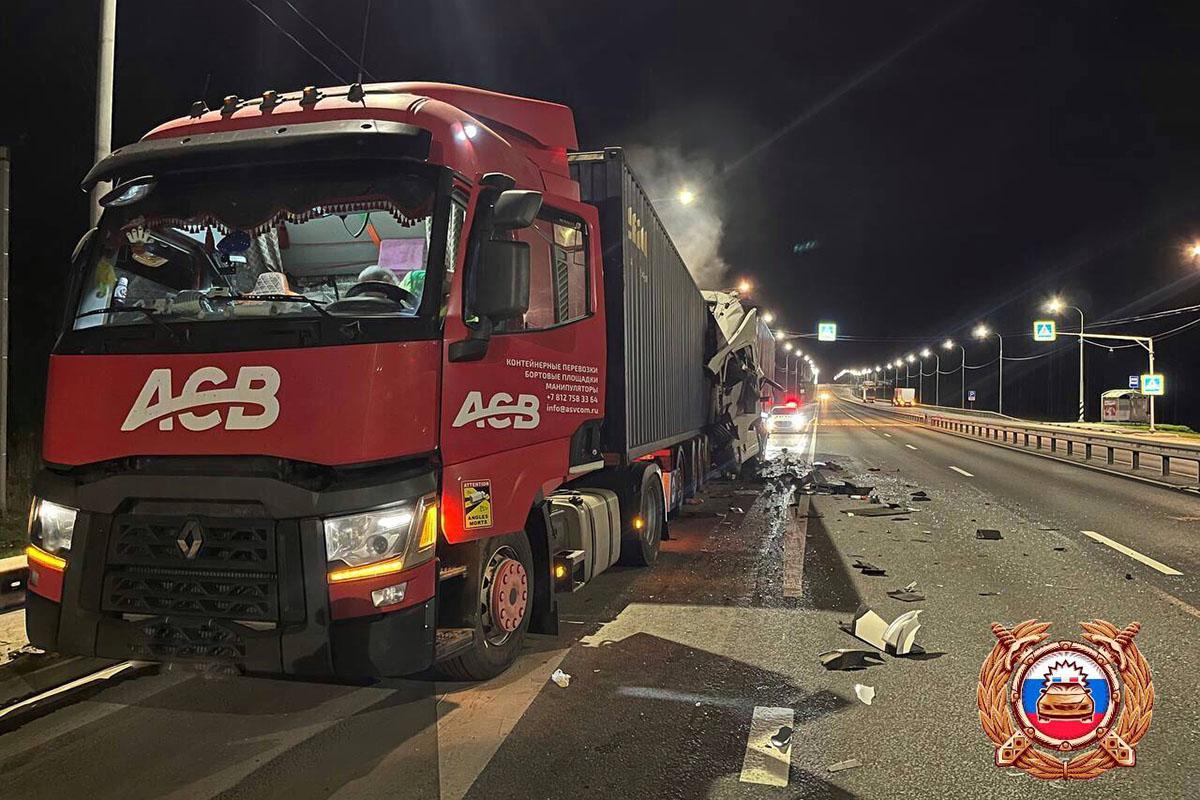 По предварительным данным, водитель большегруза Volvo не выбрал безопасную дистанцию и совершил столкновение с большегрузом Renault, который в этот момент стоял в полосе разгона. Другие обстоятельства происшествия устанавливаются.