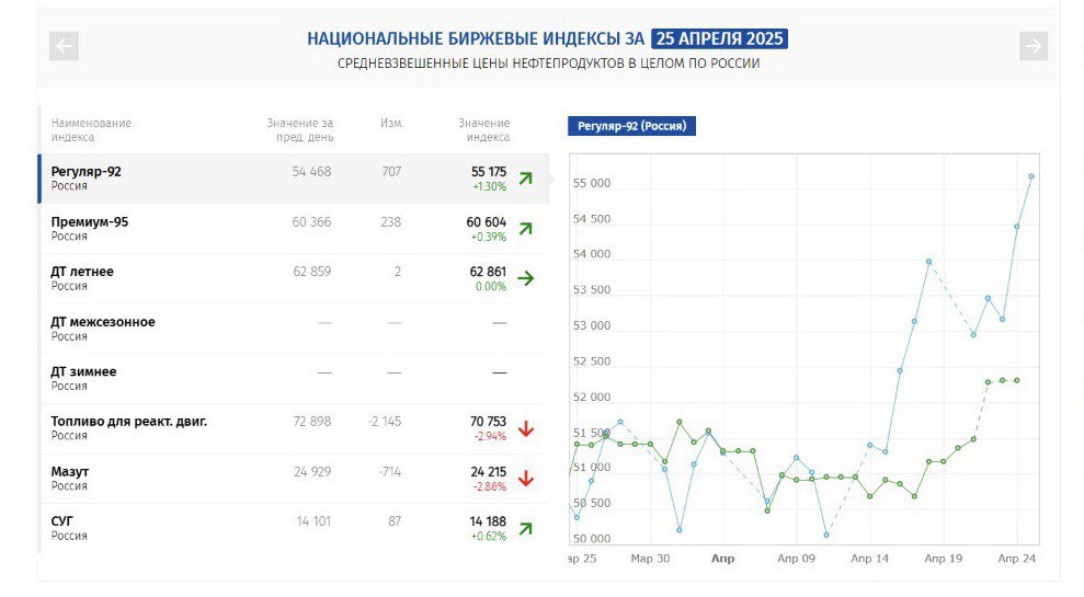 АИ-95 торгуется по 60,604 тыс. рублей за тонну, АИ-92 по 55,175 тыс. рублей, ДТ (летнее) по цене 62,861 тыс. рублей за тонну