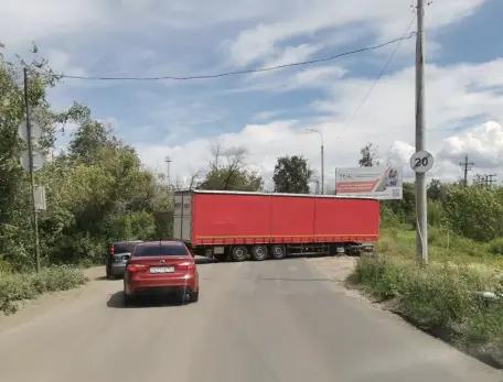 Дорожное ЧП случилось на улице Магистральная, где огромная грузовая фура "раскорячилась" прямо на проезжей части. Странный маневр дальнобойщика привел к тому, что движение по улице Магистральная затруднено до крайности.