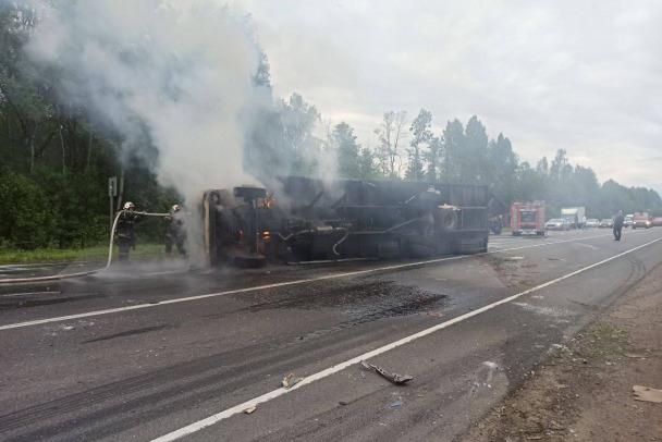 В соцсетях очевидцы публикуют кадры с места столкновения. Видно, как пламя охватило один грузовой автомобиль, второй улетел с трассы.