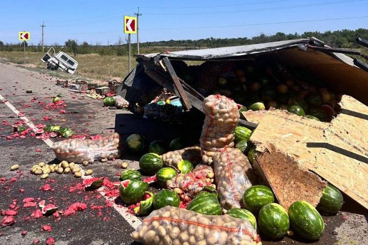 7 июля в Волгоградской области на 600-м километре трассы Сызрань-Саратов-Волгоград грузовая "ГАЗель" с арбузами и картофелем съехала на обочину и опрокинулась. Об этом сообщает ГАИ соседнего региона.