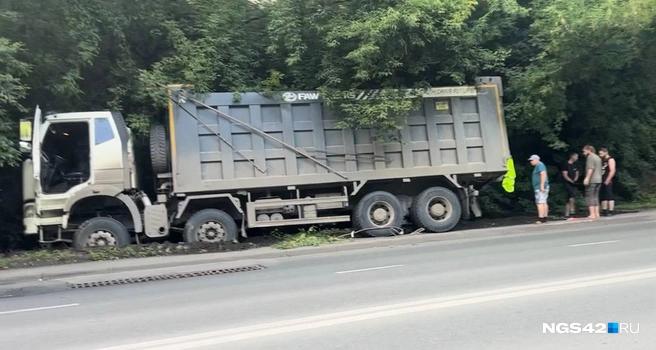 На Логовом шоссе в Кемерове фура съехала в кювет — у неё отказали тормоза. Информация о ДТП появилась в телеграм-канале «Дорожная жизнь Кемерово».
