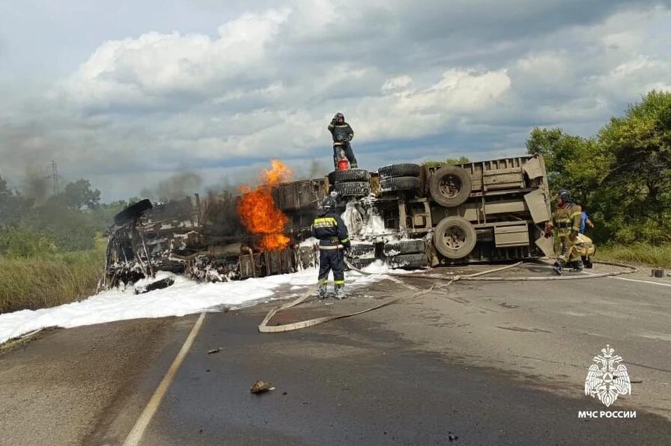 На 541-м километре автодороги А-370 «Уссури» сегодня днем произошло жесткое ДТП с участием фуры и легкового автомобиля. После столкновения большегруз опрокинулся и мгновенно вспыхнул. Об этом пишет «КП – Дальний Восток» со ссылкой на полицию Приморья.