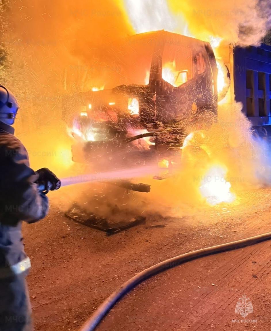 Пожар случился минувшей ночью, 27 августа, в Балабанове. Пламенем оказался объят грузовик.