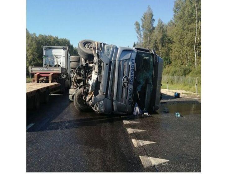 50-летний водитель за рулем автомашины «ВАФ», не справился с управлением наехал на отбойник и положил фуру на бок.
