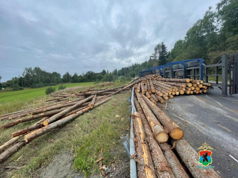 По предварительным данным полиции, водитель лесовоза не справился с управлением и перевернулся. В результате бревна разлетелись по дороге. Пострадавших нет.