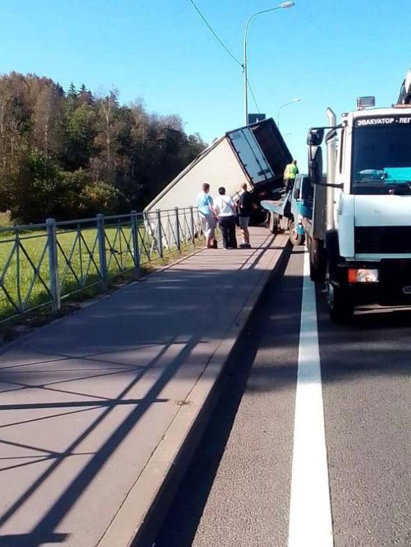 Авария произошла в районе поселка Бабино. На кадрах с места видно, что один грузовик опрокинулся на бок на одной стороне дороги. Второй таранил разделительный барьер и оказался в кювете за встречной полосой.