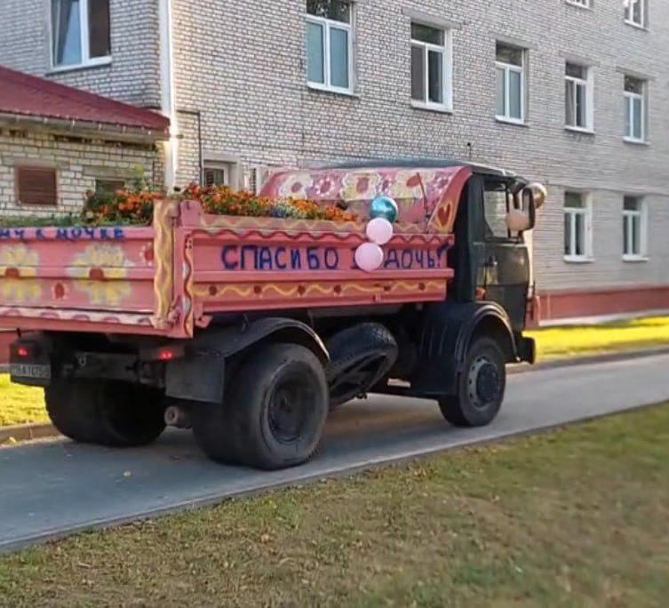 Судя по комментариям, событие произошло в Молодечно. На кадрах видно, как счастливый отец подъезжает к роддому на грузовой машине, доверху забитой цветами. Кузов, по всей видимости, был окрашен специально к этому случаю в розовый цвет, а на нём красуется надпись: «Спасибо за дочь!»